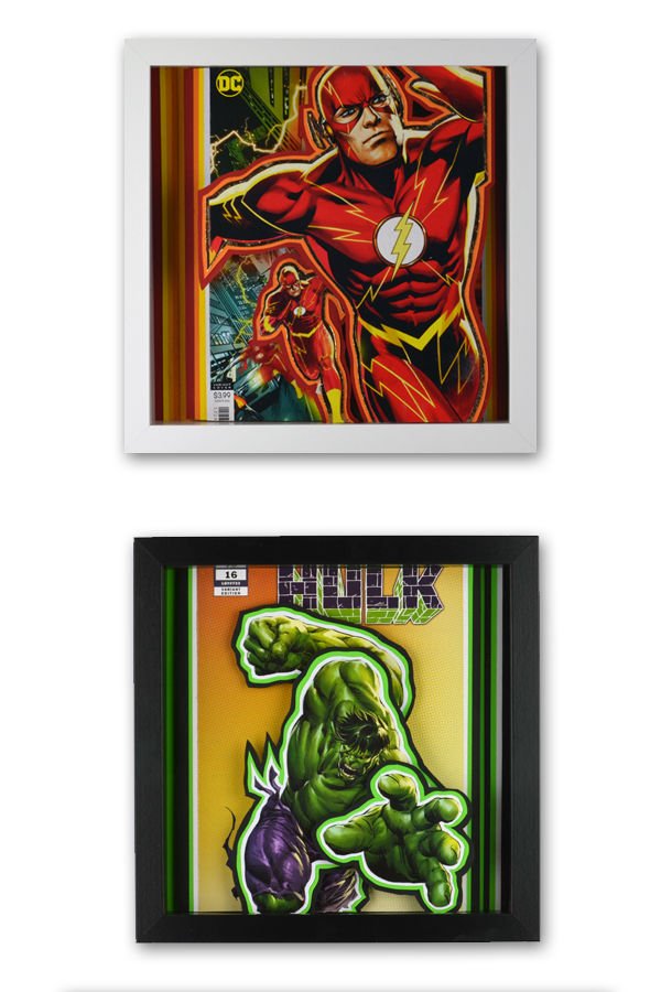 3D Comic Cubes feature classic Comic Book Covers presented in a 3D "Pop Out" style, giving depth to often 2D artistic imagery. These collages are 9"x9" and are deeper than our 3D Cover Pop style collages. They are great for wall or shelf display and feature a single cover.