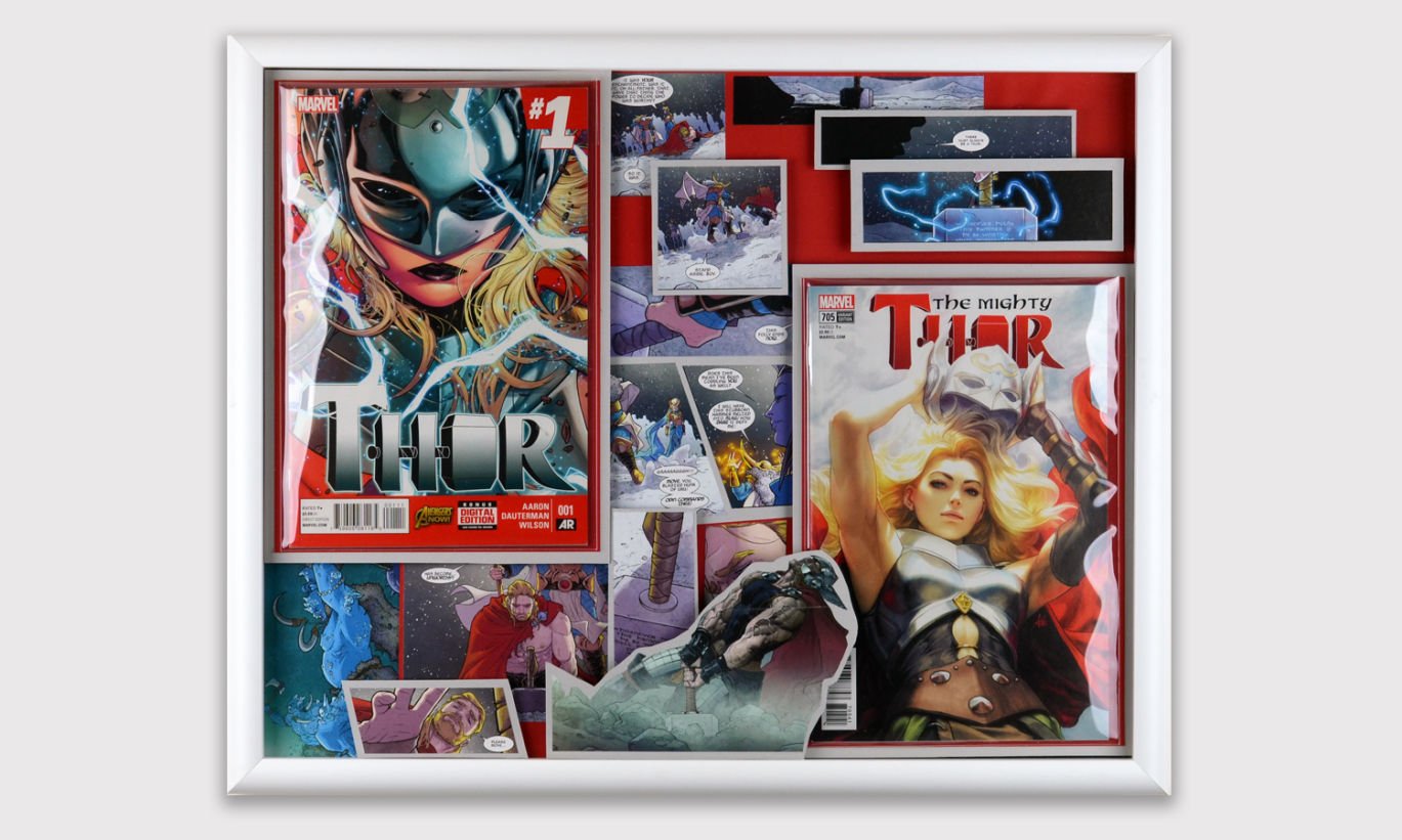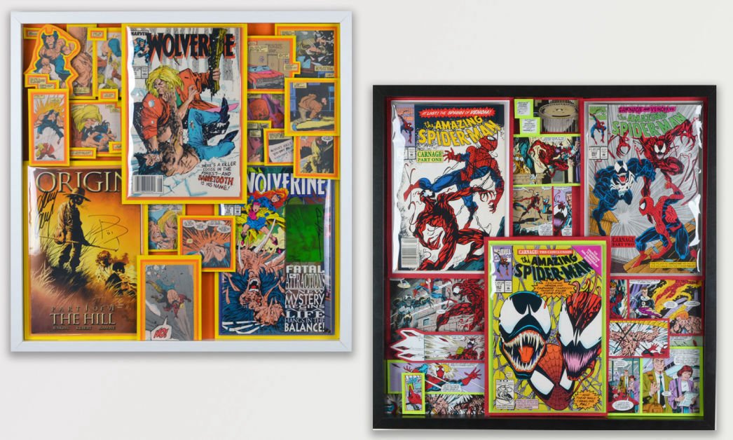 The Ultimate crowning type of 3D Comic Collage, these type of collages are an even more of a bigger sandbox to play in. In a frame that could easily house a Treasury Edition Comic Magazine from the 70's, this collage can be in "Original", "Legacy" or "Cover Pop" style... or a mix of the three! They allow for more more comics to be featured, which works well for signed pieces or an arcing cover theme. These collages come in a 21" x 21" frame.