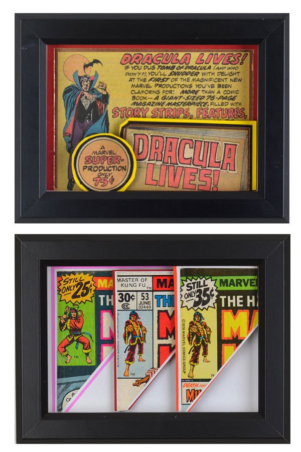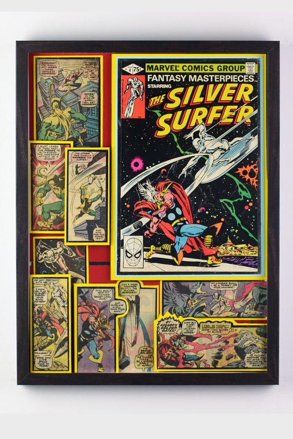 These type of collages feature one cover with the cover detached and mounted on a board with the body of the same comic used to create the collage around it. These comics are often well read and abused from years of enjoyment and are granted a new "life" of viewing enjoyment! These collages show a full cover, untouched but still allows for a fun surrounding collage around the feature. These collages come in a 12" x 16" frame.