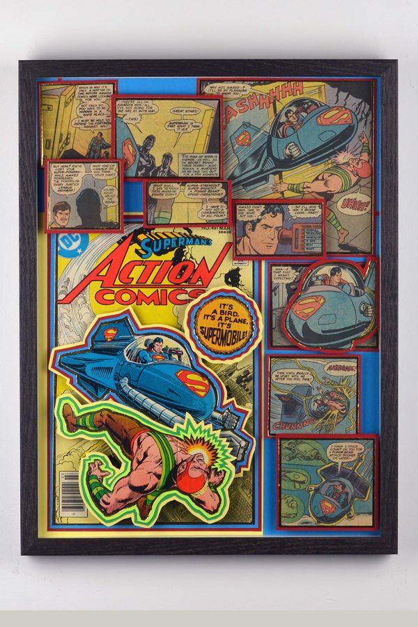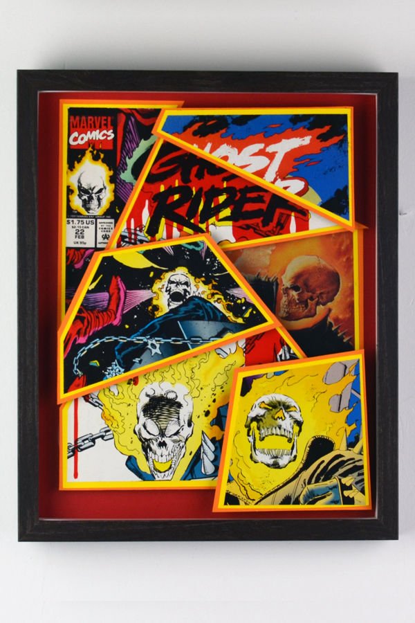 A "mash-up" of multiple comic book covers presented together to give it a new look. These pieces are truly one of a kind as they never have the same covers used twice! These are 8" x 10" in size and are great for wall or shelf display..